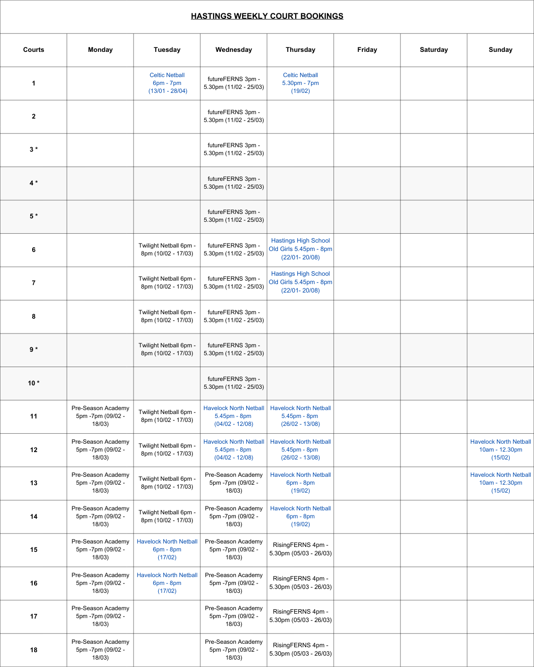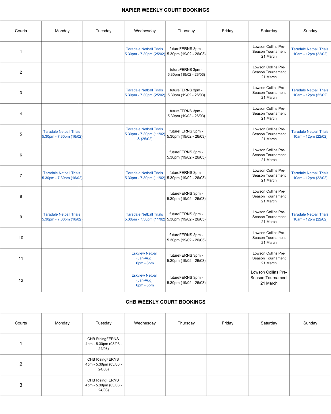 Court Booking Availability below for Hastings, Onekawa and CHB. Term One dates