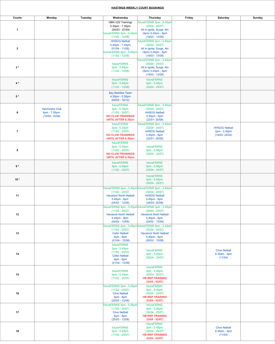 To train at any of the three venues please make sure you have made a court booking.