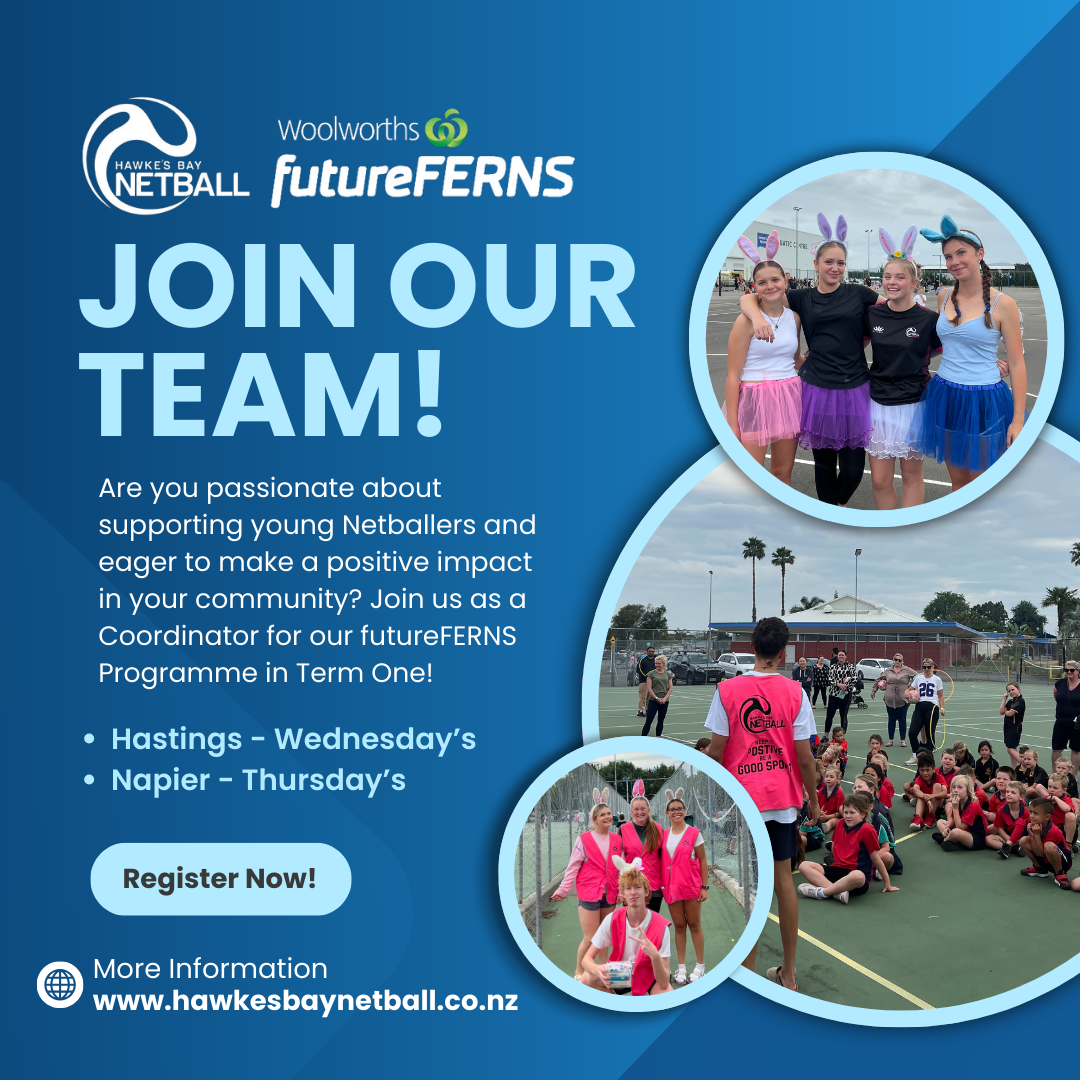 Are you passionate about supporting young netballers and keen to make a positive impact in your community? Join us as a Coordinator for our Year 1–4 futureFERNS Programme in Term One!
